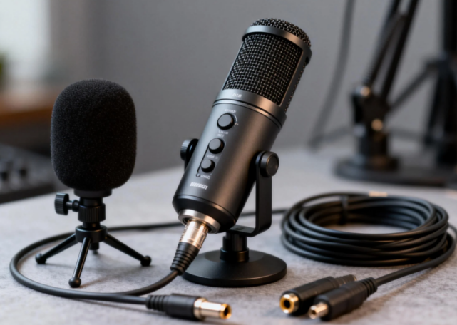 Professional audio recording solutions including microphones, stands, and accessories for content creation and broadcasting.